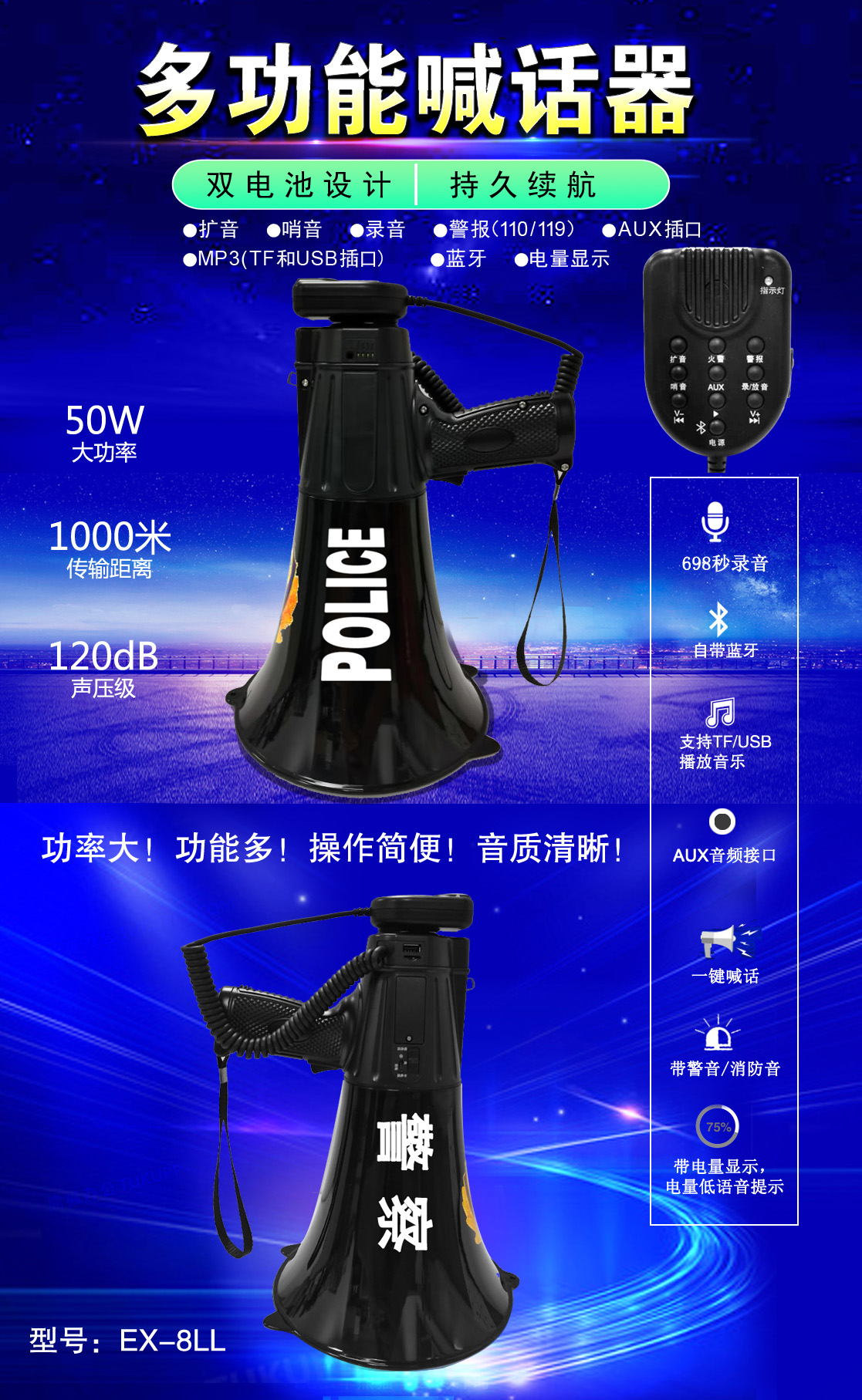 • 专业设计,外观独特、新颖,操作简便的多功能喊话器