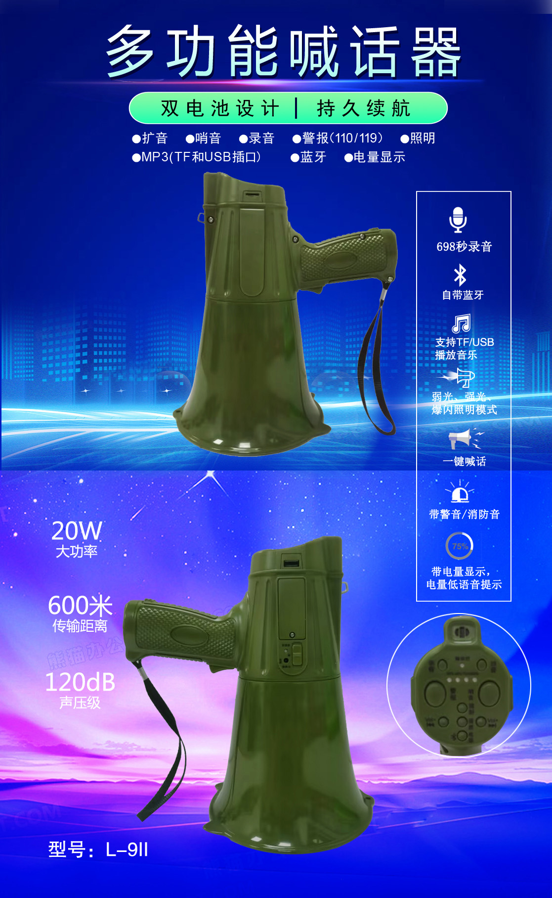 • 专业设计,外观独特、新颖,操作简便的多功能喊话器