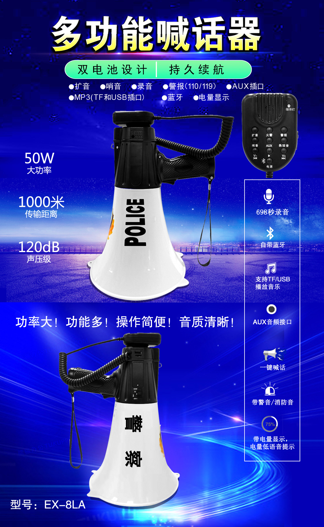 • 专业设计,外观独特、新颖,操作简便的多功能喊话器
